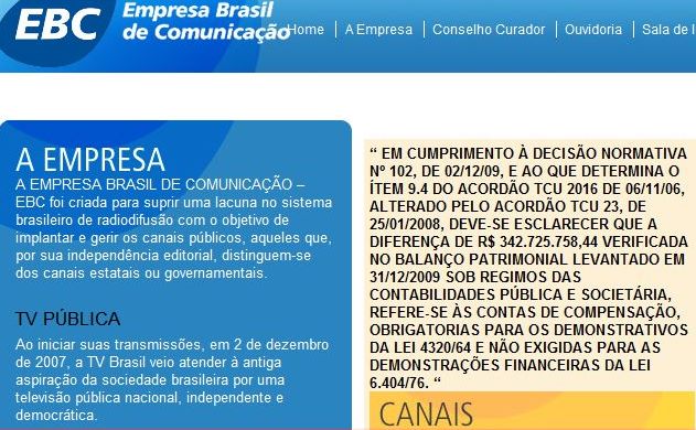 A página da EBC ( http://www.ebc.com.br ) amanheceu em branco nesta segunda. Nela estão Agência Brasil (ainda continua com a subpágina provisória) , TV Brasil, Rádio Brasil, desculpe, Nacional, etc e tal.