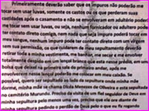 “Primeiramente deverão saber que os impuros não poderão me tocar sem usar luvas, somente os castos ou os que perderam suas castidades após o casamento e não se envolveram em adultério poderão me tocar sem usar luvas, ou seja, nenhum fornicador ou adúltero poderá ter contato direto comigo, nem nada que seja impuro poderá tocar em meu sangue”.