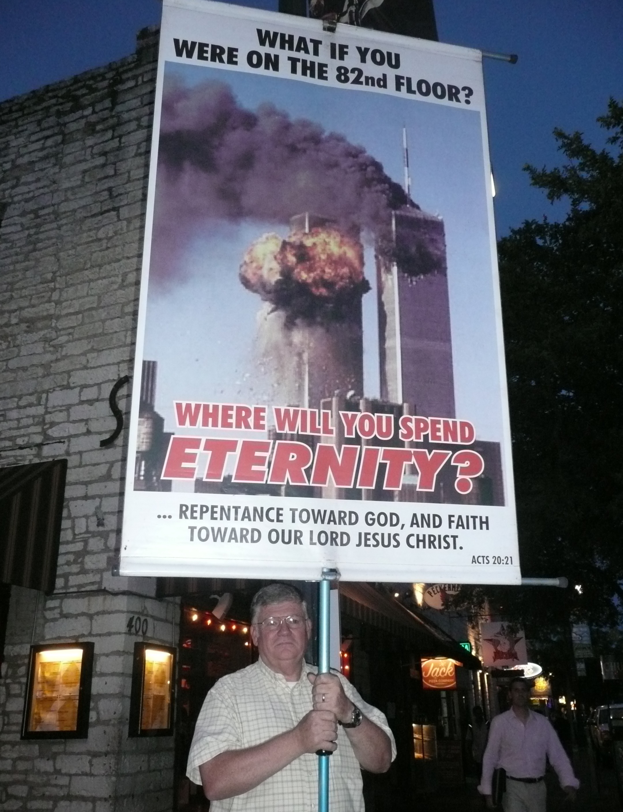 Agora, para terminar a passagem por Austin, Texas, a cidade do pecado gostoso, texanas grandonas de shortes pequenos, mas nao arrebitados que nem as das brasileiras, na sexta avenida me aparece uma dupla de pastores pentecostais e tais, tipo TEA PARTY, pregando simplesmente seguinte: